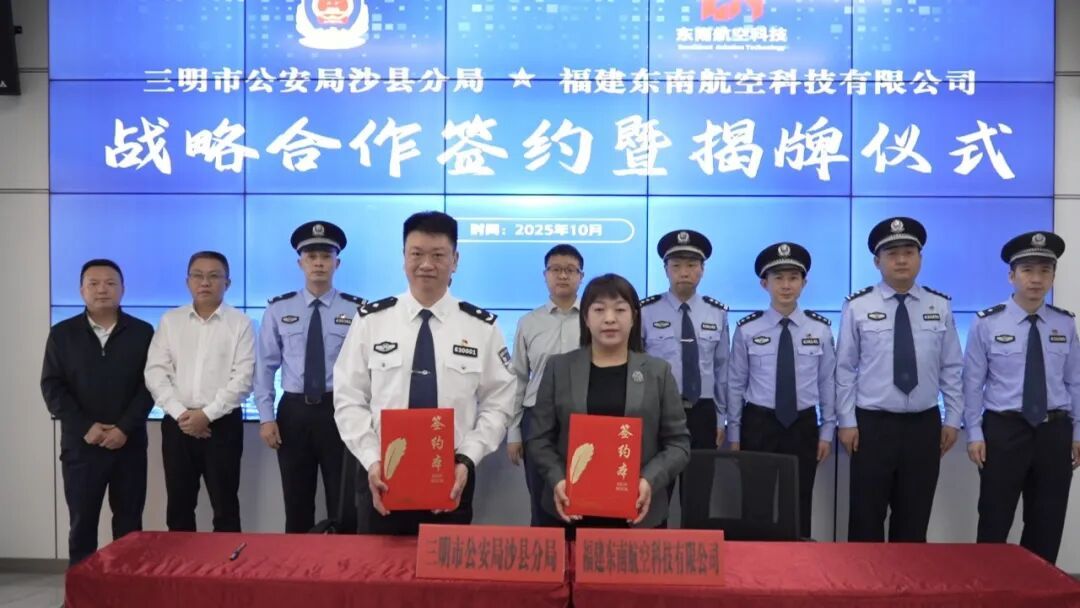 日前,三明市公安局沙县分局与福建东南航空科技有限公司举行战略合作协议签约仪式,并为海西工贸区生态警务联勤工作站揭牌。副区长、沙县公安分局局长王国泰参加活动。