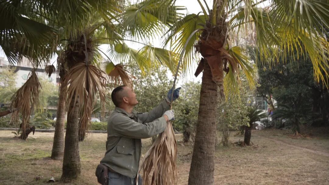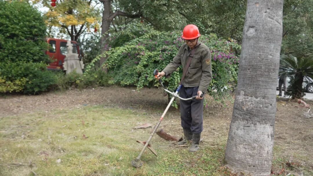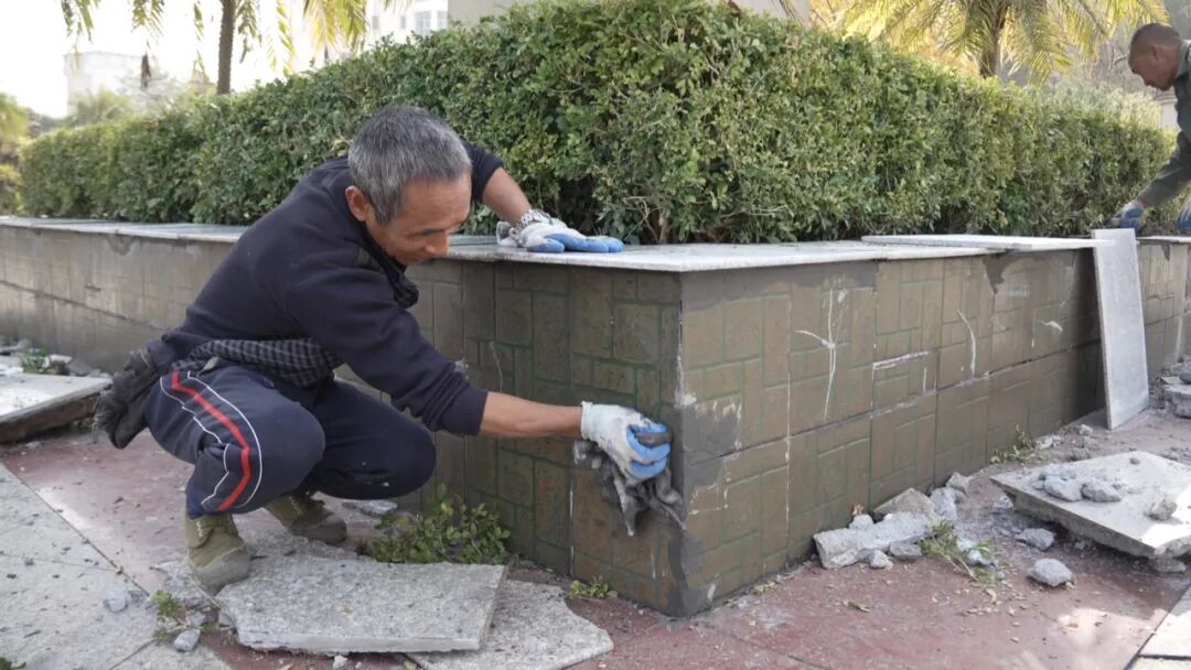 公园内,工人正对破损的花坛瓷砖进行更换铺贴,同时对各区域的枯枝杂草进行修剪和清理。