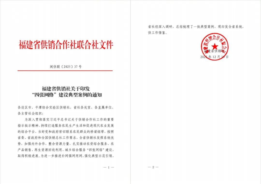 近日 福建省供销合作社联合社正式发布 一批“四张网络”建设典型案例 沙县区供销社的相关经验做法 成功入选并获发文推广