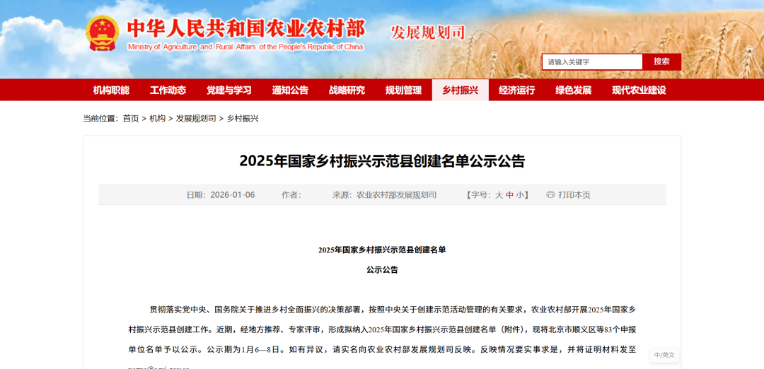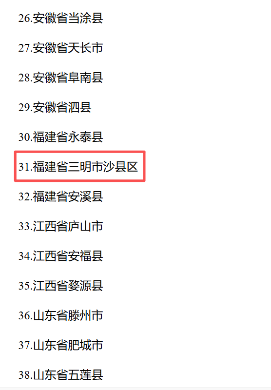 为贯彻落实党中央、国务院关于推进乡村全面振兴的决策部署,农业农村部开展2025年国家乡村振兴示范县创建工作。1月6日,农业农村部发布2025年国家乡村振兴示范县创建名单公示公告,沙县区成功入选。