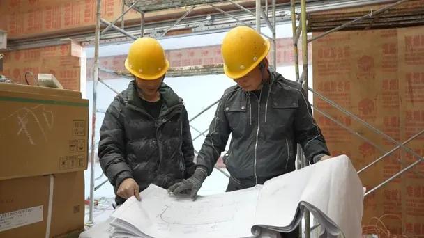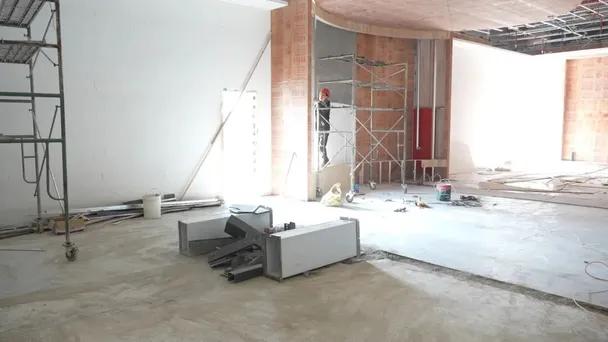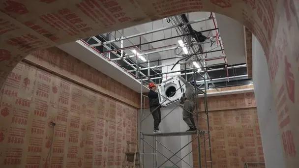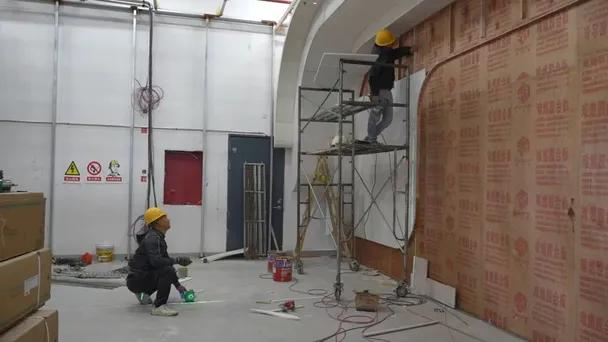 科技创新智慧展厅内,施工人员正在紧锣密鼓地进行内部骨架搭建与软装基层处理,部分展墙基础结构已清晰可见,即将进入布展阶段。