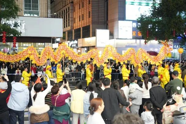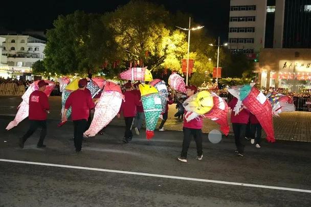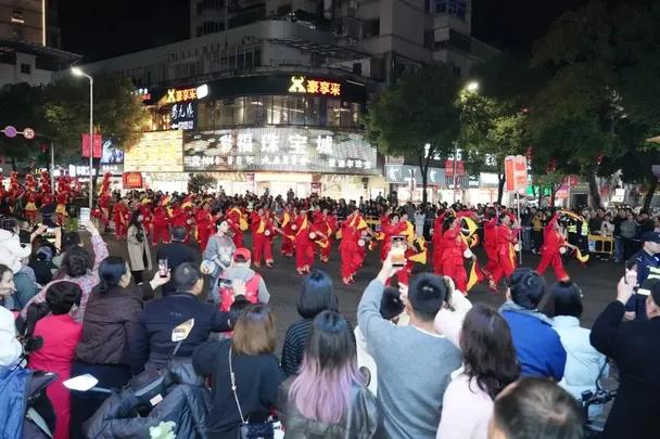 随着民俗展演落幕,踩街活动随之开启,欢乐的氛围蔓延至城区主干道。由6个乡镇550名群众组成的12支沿街巡游方阵,阵容整齐、气势恢宏,他们从体育公园北广场出发,沿着长泰南路、新城中路、三官堂路、府前中路巡游,市民们夹道观看、挥手互动,处处洋溢着元宵佳节的喜庆与祥和。