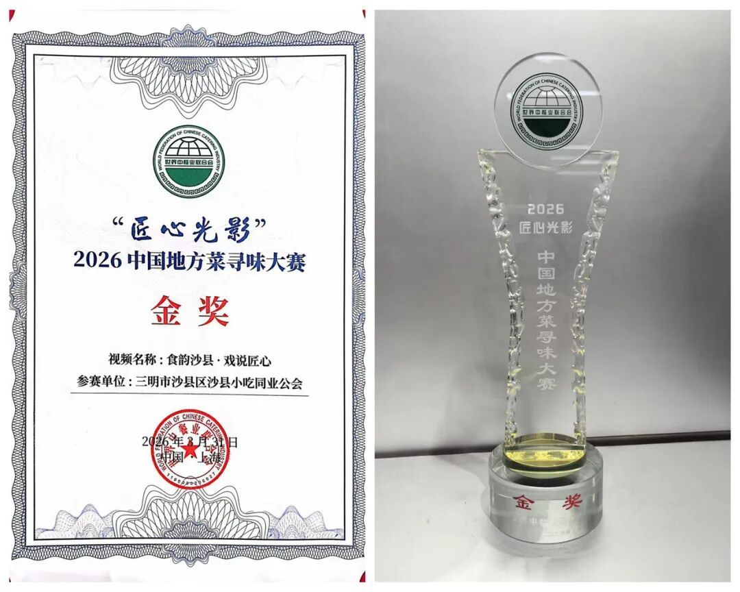 3月31日,由世界中餐业联合会主办的第八届地方菜发展交流会(“匠心光影”颁奖) 在上海虹桥国家会展中心举行。全国餐饮行业精英、地方菜系代表齐聚一堂,共话地方菜传承创新与产业升级。沙县区沙县小吃同业公会选送的作品《食韵沙县•戏说匠心》,凭借对沙县小吃文化的深度挖掘与沙县小吃的制作精髓的展示,从全国百余部参赛作品中脱颖而出,荣获“匠心光影”2026中国地方菜寻味大赛金奖。 《食韵沙县・戏说匠心》以“戏中戏”的幽默结构,将年轻人反催婚的当代议题与沙县深厚的地方风物巧妙融合。创作核心让剧中的每一种特色美食(板鸭、糖醋藠、红菇鸡)都成为戏剧冲突的载体与情感隐喻——板鸭的“三晒三烤”工艺被类比为大龄焦虑,糖醋藠头联系着传统婚嫁习俗,红菇鸡汤则承载着关爱与误解。其文化亮点正蕴含于这种生动的日常叙事中:不仅自然展示了沙县小吃的制作精髓与饮食智慧,更通过代际碰撞与喜剧误会,让“产业扶持”“乡村振兴”“美食无界”等现代观念,与古朴的民俗传统达成了和解与共鸣,最终落点到“传美食文化,承烟火之韵”的情感内核上,获得评委高度认可。